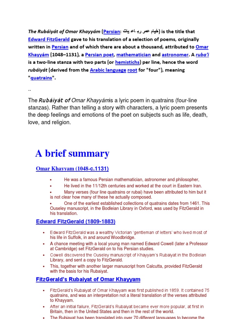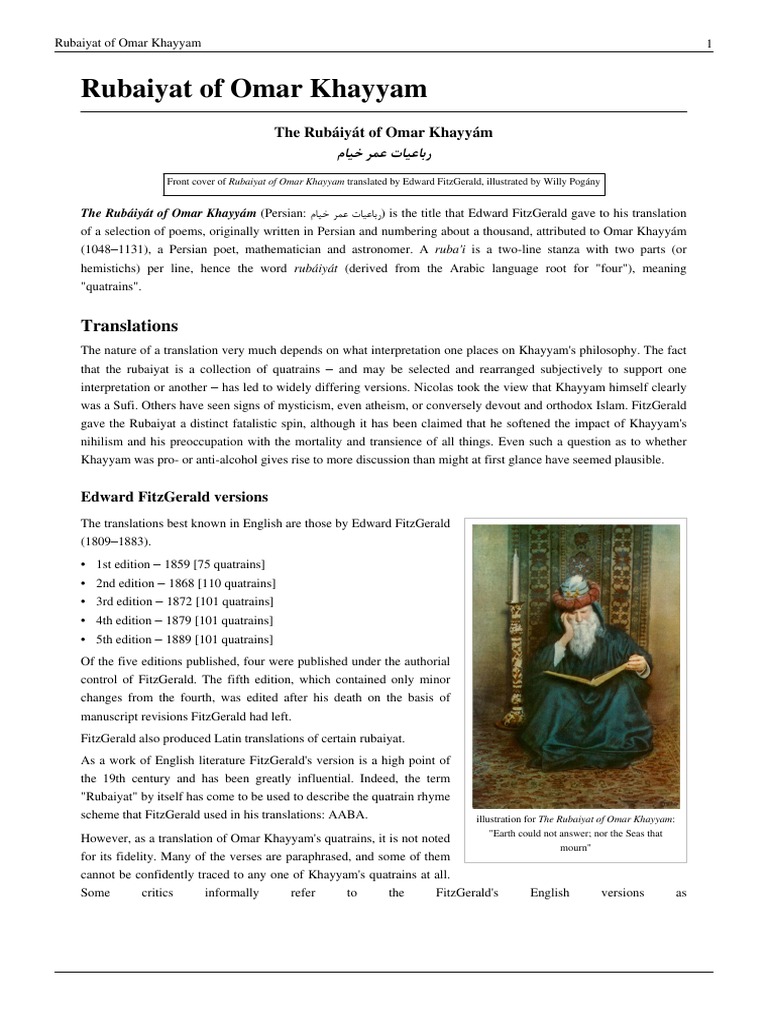 English Translations of the Rubaiyat Over the past one hundred and fifty years the quatrains of Khayyam have been. The Rubaiyat of Omar Khayyam by Omar Khayyam. When you want it.